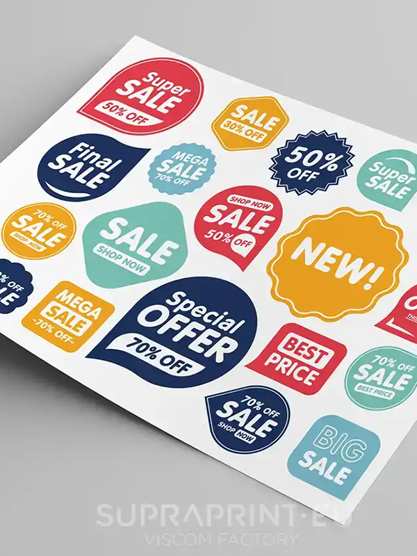 Affordable sticker sheet printing. Choose between paper, synthetic, or transparent materials. Same-day delivery available.